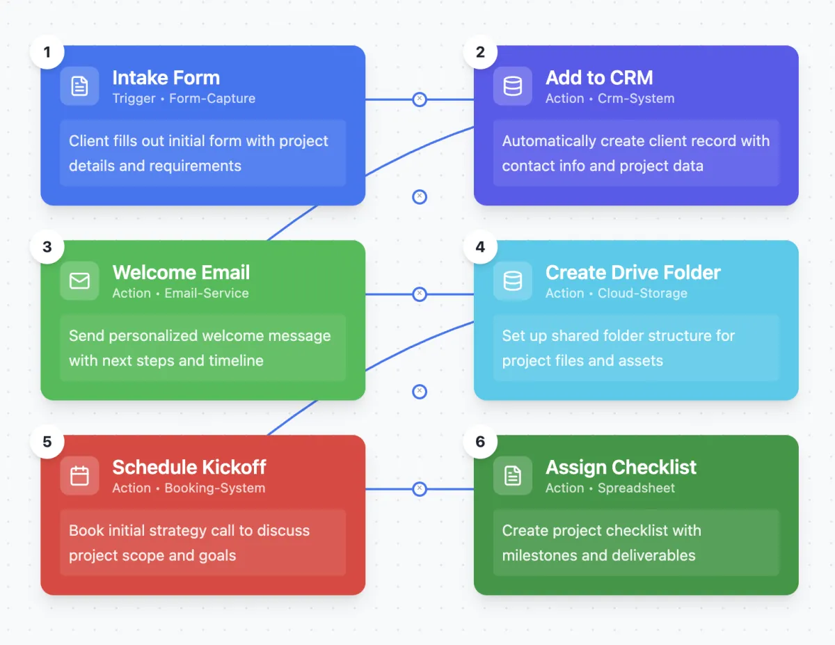 Streamline intake forms, welcome emails, calendar bookings, folder setup, and team handoffs, all triggered automatically.